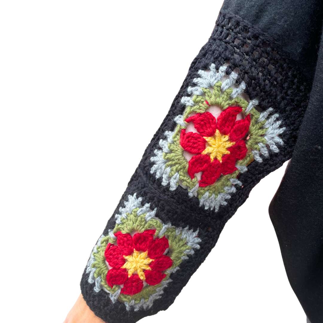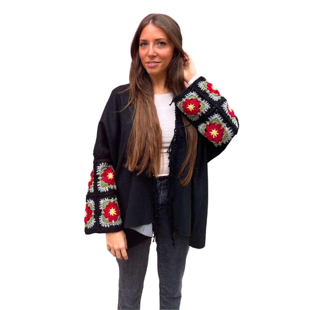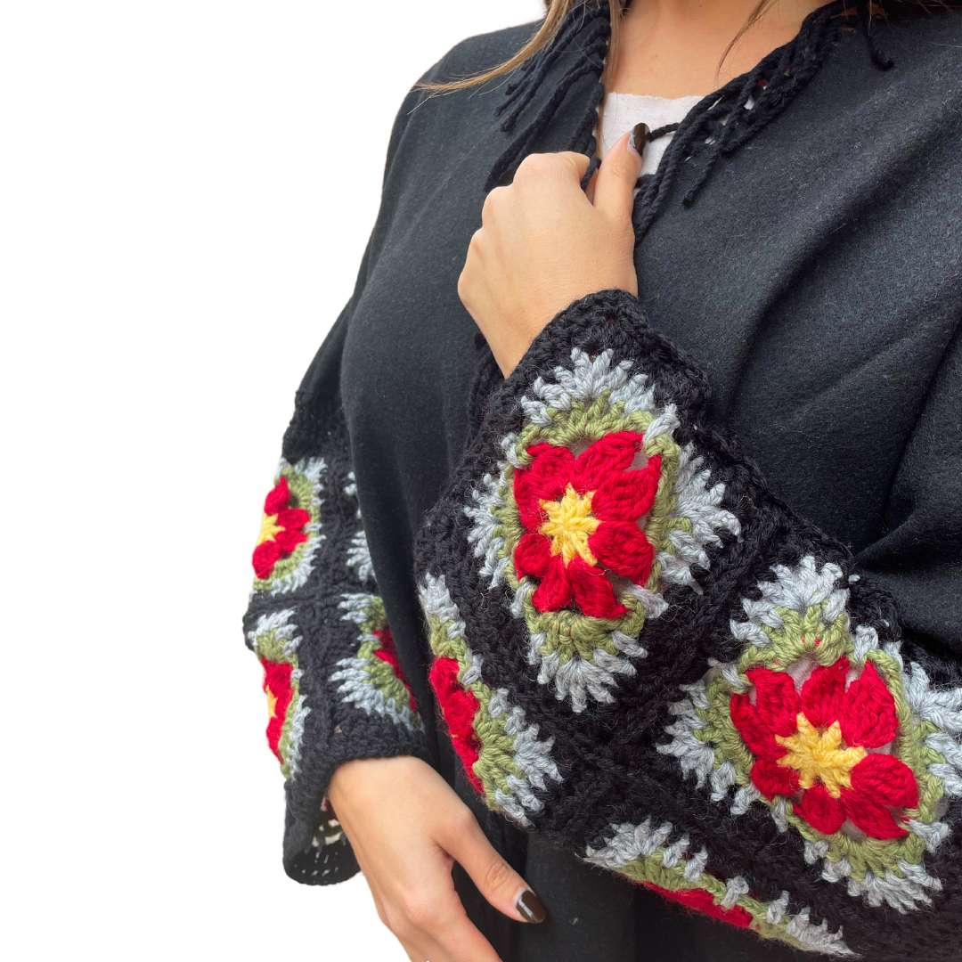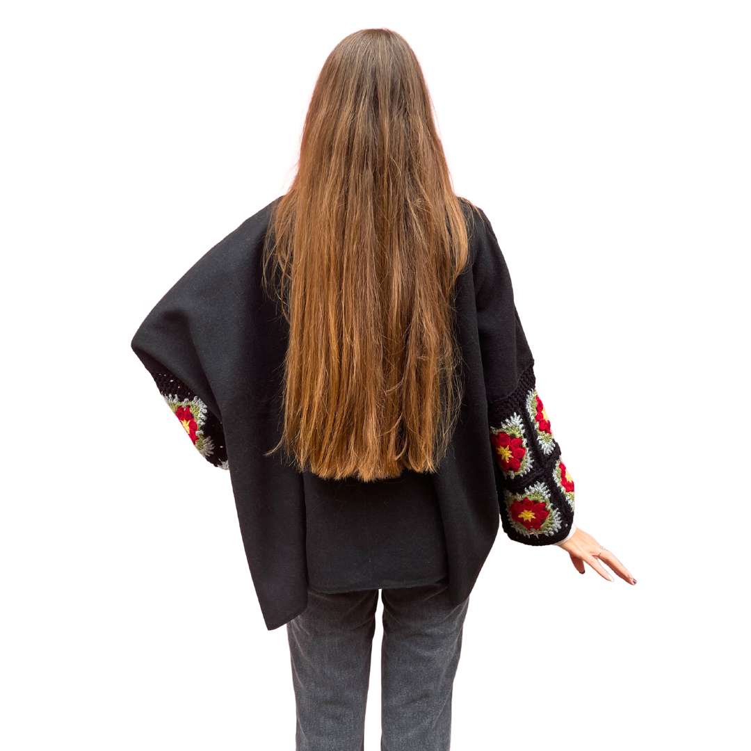 Zoe è un capo unico della nostra collezione di Mantelle da donna Handmade, pensata per unire raffinatezza e semplicità in un design esclusivo. Le maniche sono impreziosite da 2 strati di ricami a forma di mattonella, con dettagli floreali delicati che donano un tocco di eleganza senza tempo.