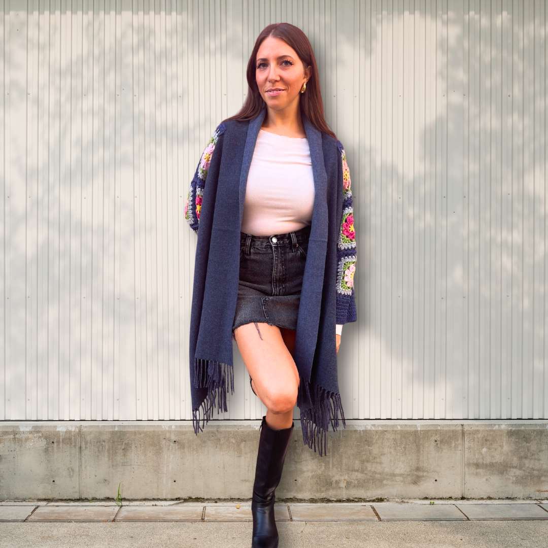 La Mantella in lana da donna è un capo esclusivo AM Bijoux. Il suo blu jeans profondo e raffinato la rende perfetta per le tue occasioni. Le maniche sono impreziosite da raffinati ricami a forma di mattonelle, disposti su 3 strati sovrapposti, ognuno decorato con delicati motivi floreali.