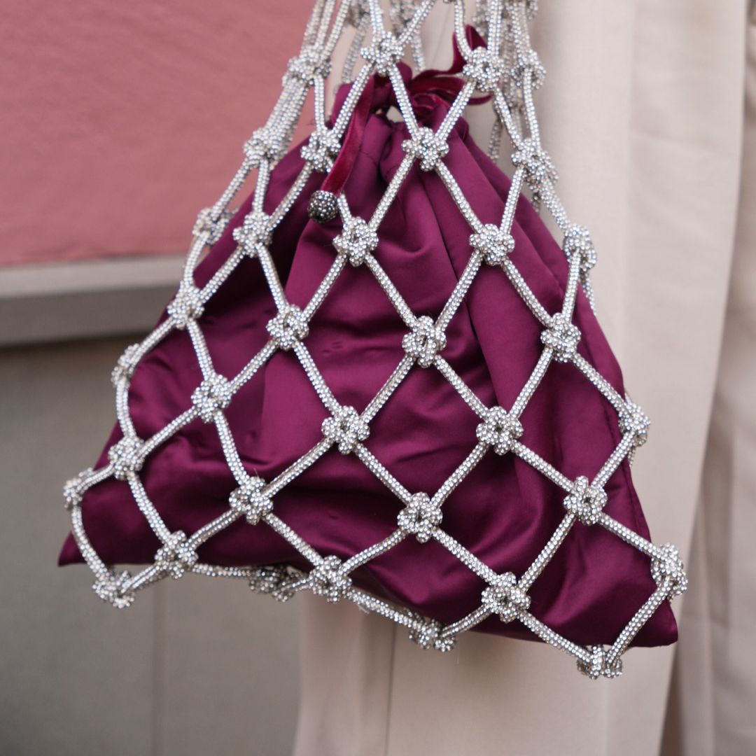 Borsa realizzata a mano in cordino strass e pochette in raso intercambiabile